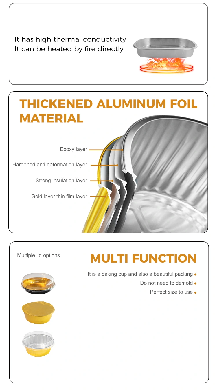 یہ انڈے کے ٹارٹس ، براؤنیز ، کپ کیکس ، پیزا کے واحد ٹکڑے یا فلکی پیسٹری کے لئے بہترین پیکیجنگ ہے۔ ایلومینیم ورق کی موصلیت کی پراپرٹی پیسٹری کی پکانے کے بعد ہی پیسٹری کی گرم جوشی اور نرم ساخت کو برقرار رکھنے میں مدد دیتی ہے۔ یہ ذائقہ کو بالکل برقرار رکھتا ہے اور بیکریوں اور کیفے سے ٹیک آؤٹ کے ل suitable موزوں ہے۔