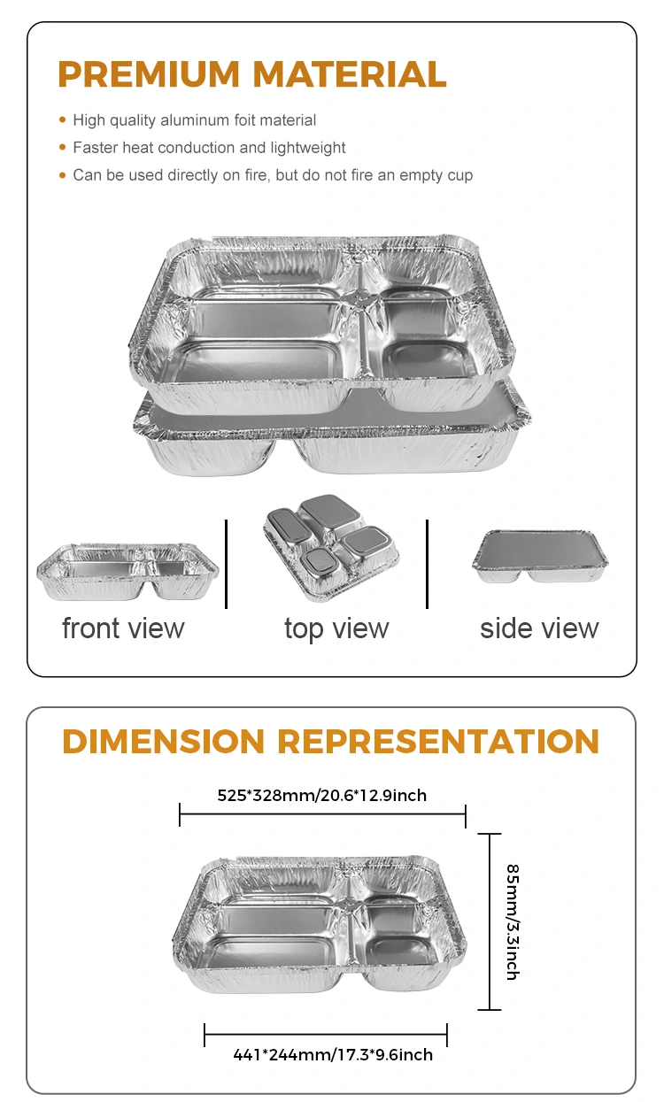 یونچو ایلومینیم ورق سپلائی فیکٹری نے ایک نیا ڈسپوز ایبل ملٹی کمپارٹمنٹ فاسٹ فوڈ سلور ایلومینیم ورق کنٹینرز ، ماڈل نمبر 78400 کا آغاز کیا۔ کنٹینر چالاکی سے ڈیزائن کیا گیا ہے ، جس کا اوپری قطر صرف 24 ملی میٹر (9.6 انچ) اور 195 ملی میٹر (7.6 انچ) اور 168 ملی میٹر (8.6 انچ) اور 168 ملی میٹر (8.5 ان) اور 168 ایم (8.5 ان) کے ساتھ ہے۔ (1.6 انچ) تقریبا 1020 ملی لیٹر (36.0 آانس) کی گنجائش کے ساتھ ، چار حصوں میں طرح طرح کے کھانے کی اشیاء رکھنے کے لئے یہ آسان اور عملی ہے۔