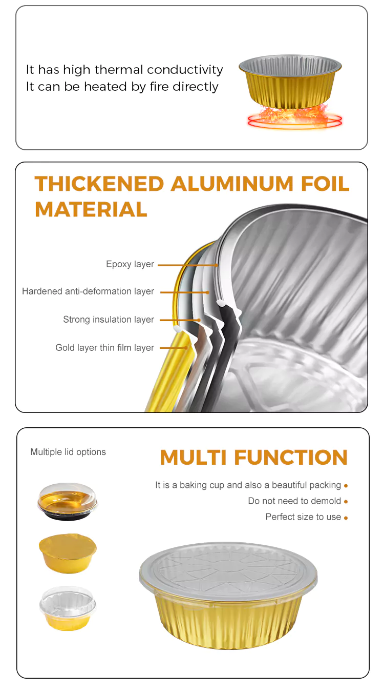 بہترین گرمی کی ترسیل کی کارکردگی ڈسپوز ایبل راؤنڈ بڑی صلاحیت سونے کے ایلومینیم ورق کنٹینرز کے بنیادی فوائد میں سے ایک ہے۔ ایلومینیم ورق گرمی اور یکساں طور پر گرمی کا انعقاد کرتا ہے۔ چاہے اسے تندور میں پکایا جائے ، کھلی شعلہ پر گرم ہو یا مائکروویو تندور میں ، اس سے یہ یقینی بن سکے کہ کھانا یکساں طور پر گرم کیا جائے ، کھانا پکانے کا وقت مختصر کریں اور اجزاء کا اصل ذائقہ برقرار رکھیں۔ سرکلر ڈیزائن گرمی کی گردش کے لئے زیادہ سازگار ہے۔ سیل ایبل ایلومینیم ورق کے احاطہ کے ساتھ جوڑا بنا ، یہ نہ صرف نمی کے نقصان کو روک سکتا ہے بلکہ مربوط تحفظ اور حرارتی نظام کو بھی حاصل کرسکتا ہے۔ ٹیک آؤٹ کی ترسیل کے دوران ، یہ کھانے کو مؤثر طریقے سے گرم رکھ سکتا ہے ، جس سے صارفین کسی بھی وقت گرم کھانے سے لطف اندوز ہوسکتے ہیں۔