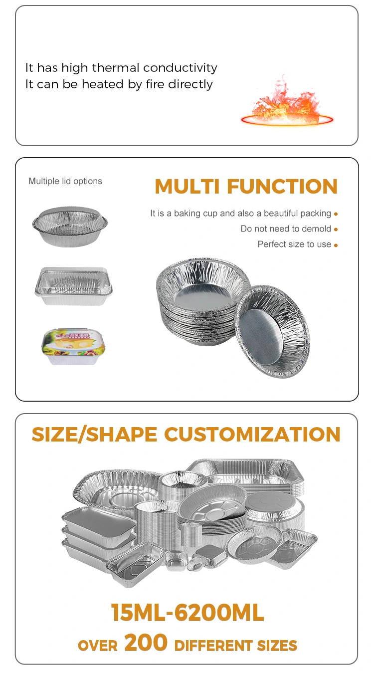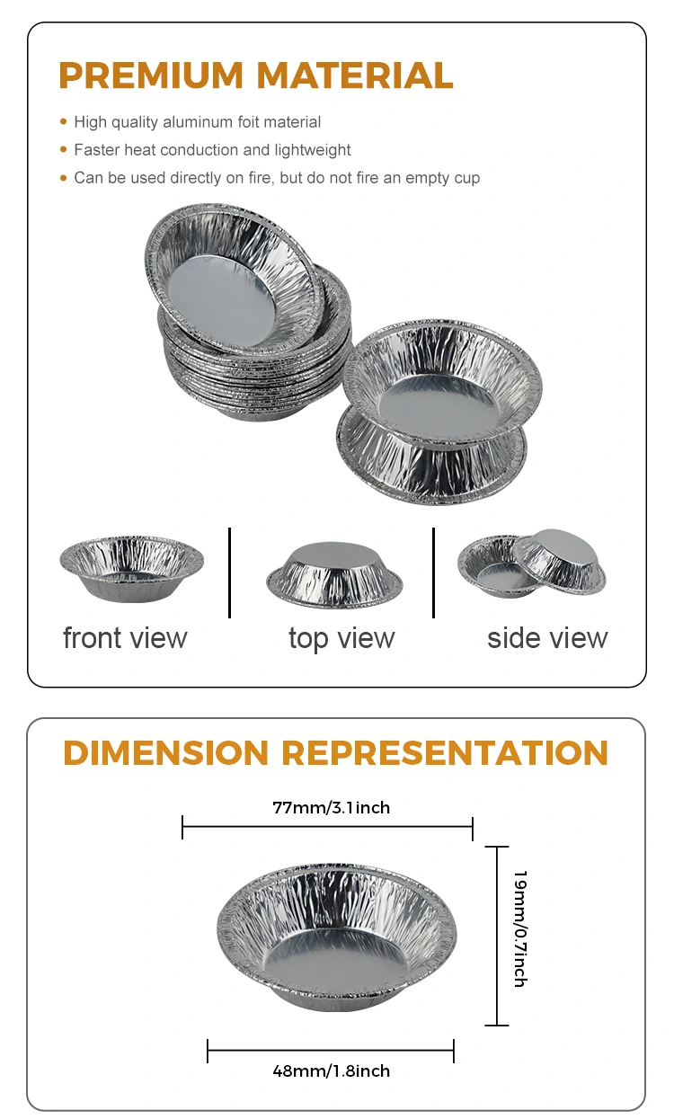 ناشتے کے لئے یہ گول انڈے کا ٹارٹ سلور ایلومینیم ورق فوڈ کنٹینر 8011 فوڈ رابطہ گریڈ ایلومینیم ورق مواد سے بنا ہے ، جو کھانے کے ساتھ رابطے میں حفاظت کو یقینی بناتا ہے ، خراب ہونا آسان نہیں ہے اور لیک کرنا آسان نہیں ہے۔ اس کی موٹائی مضبوط ، سنکنرن مزاحم ، اعلی درجہ حرارت کی مزاحمت ، اور طویل خدمت کی زندگی ہے۔