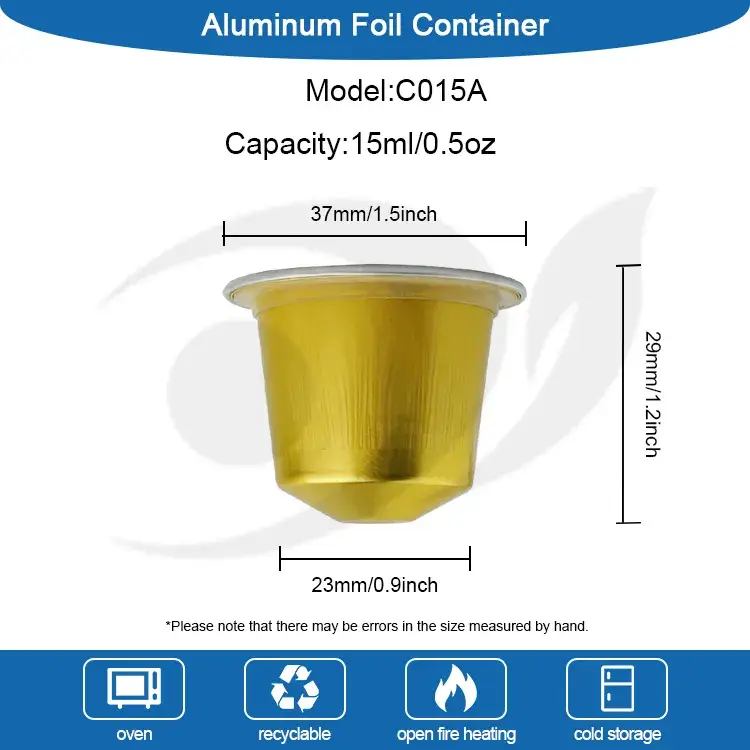 یونچو ایلومینیم ورق فراہم کنندہ سلیکون سیل خالی کافی کیپسول C015A مندرجہ ذیل سائز میں: ٹاپ قطر 37 ملی میٹر (تقریبا 1.4 انچ) ، بیس قطر 23 ملی میٹر (تقریبا 0.9 انچ) ، اونچائی 29 ملی میٹر (تقریبا 1.1 انچ)۔ اس کیپسول میں زمین کافی ، کافی مائع 15 ملی لیٹر (تقریبا 0.5 0.5 آانس) ہے۔ تمام نیسپریسو مشینوں کے لئے موزوں ، پیکیجڈ ایسپریسو مائع ، اور یہاں تک کہ نائٹروجن کلیننگ کے ساتھ بھی بڑھایا جاسکتا ہے۔ اس کے علاوہ ، لوگو اور رنگ کو بھی اپنی مرضی کے مطابق بنایا جاسکتا ہے ، اور اس نمونہ کو ایلومینیم ورق کے احاطہ پر چھاپا جاسکتا ہے ، اور لوگو کو بھی کافی کیپسول کے نچلے حصے پر مہر لگا دی جاسکتی ہے۔