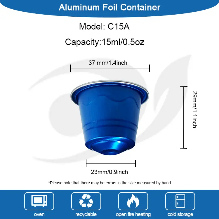 یونچو ایلومینیم ورق سپلائرز زیادہ تر کافی کیپسول مشینوں کے لئے موزوں C15A مخروطی سلیکون سیل فری خالی کافی کیپسول پیش کرتے ہیں ، جو یسپریسو مائع کو پیکج کرنے کے لئے استعمال ہوسکتے ہیں ، اور یہاں تک کہ نائٹروجن فلشنگ کے ذریعہ شیلف زندگی کو بھی بڑھا سکتے ہیں۔ اس کے علاوہ ، لوگو اور رنگوں کو اپنی مرضی کے مطابق بنایا جاسکتا ہے ، اور ایلومینیم ورق مہر پر پیٹرن کو پرنٹ کیا جاسکتا ہے ، اور کافی کیپسول کے نچلے حصے میں لوگو اسٹیمپنگ بھی کی جاسکتی ہے۔ کیپسول کے طول و عرض مندرجہ ذیل ہیں: ٹاپ قطر 37 ملی میٹر (تقریبا 1.4 انچ) ، بیس قطر 23 ملی میٹر (تقریبا 0.9 انچ) ، اونچائی 29 ملی میٹر (تقریبا 1. 1.1 انچ)۔