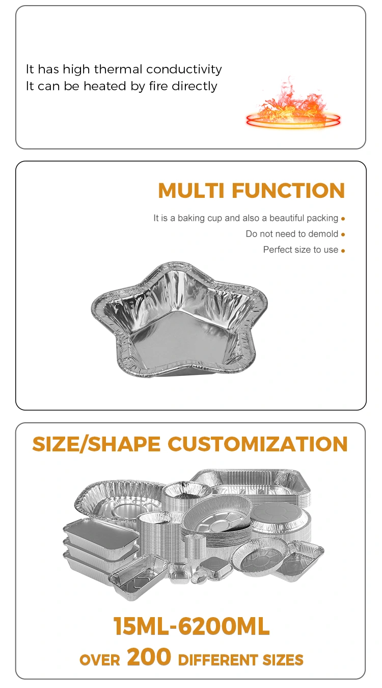 ستارے کے سائز والے ایلومینیم ورق ٹارٹ کپ چاندی کے ایلومینیم ورق سے بنے ہیں اور ان میں اعلی درجہ حرارت کی مزاحمت ہوتی ہے ، جو -20 ° C اور 300 ° C کے درمیان مستحکم رہتا ہے۔ وہ بیکنگ اور ایئر فریئر کے استعمال کے ل suitable موزوں ہیں ، اور آلات کی اندرونی دیواروں کو پہنچنے والے نقصان کو روک سکتے ہیں۔ وہ ڈسپوز ایبل ہیں ، جس کی وجہ سے ان کو آسان بنا دیا گیا ہے کیونکہ صفائی کی ضرورت نہیں ہے۔